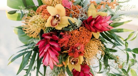 The colors of the tropical islands are part of the immense beauty that draws so many there, so why not incorporate these into your bouquet or centerpieces? Bright flowers and lush greenery make for unforgettable floral arrangements.