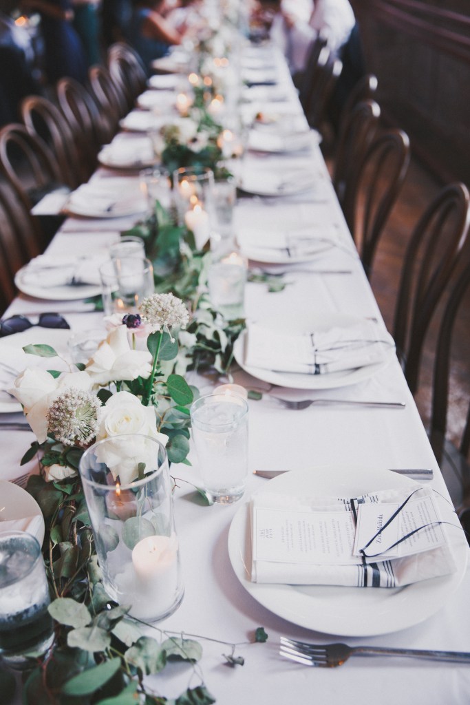 Greenery garland and stunning florals helped set the scene, complete with romantic lighting, draped fabric, and beautiful details. The bride had a vision and brought it to life!